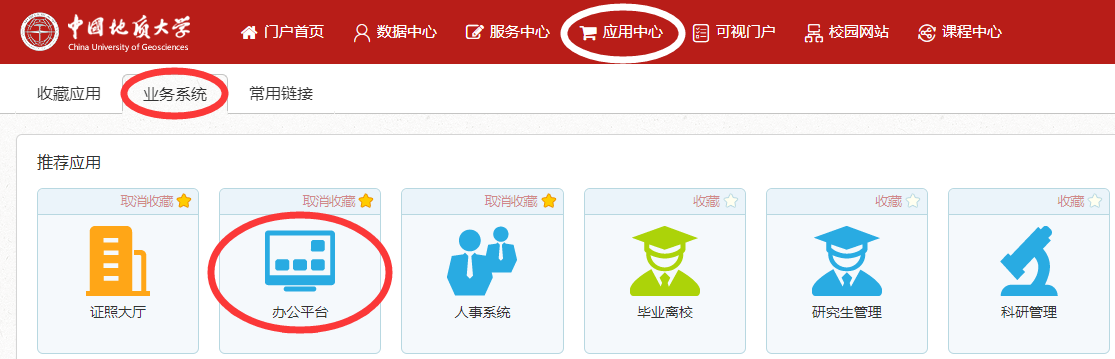 【三】学校正式印发的各类公文均可在“智慧校园—应用中心—业务系统—办公平台”中查询和下载,方法如下