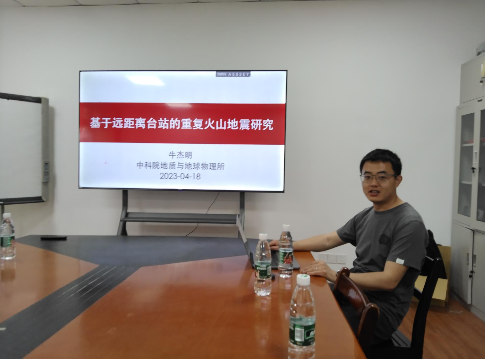 ,并在物探楼216会议室做了“基于远距离台站的重复火山地震研究”的学术报告,全校近20位师生到场聆听讲座。