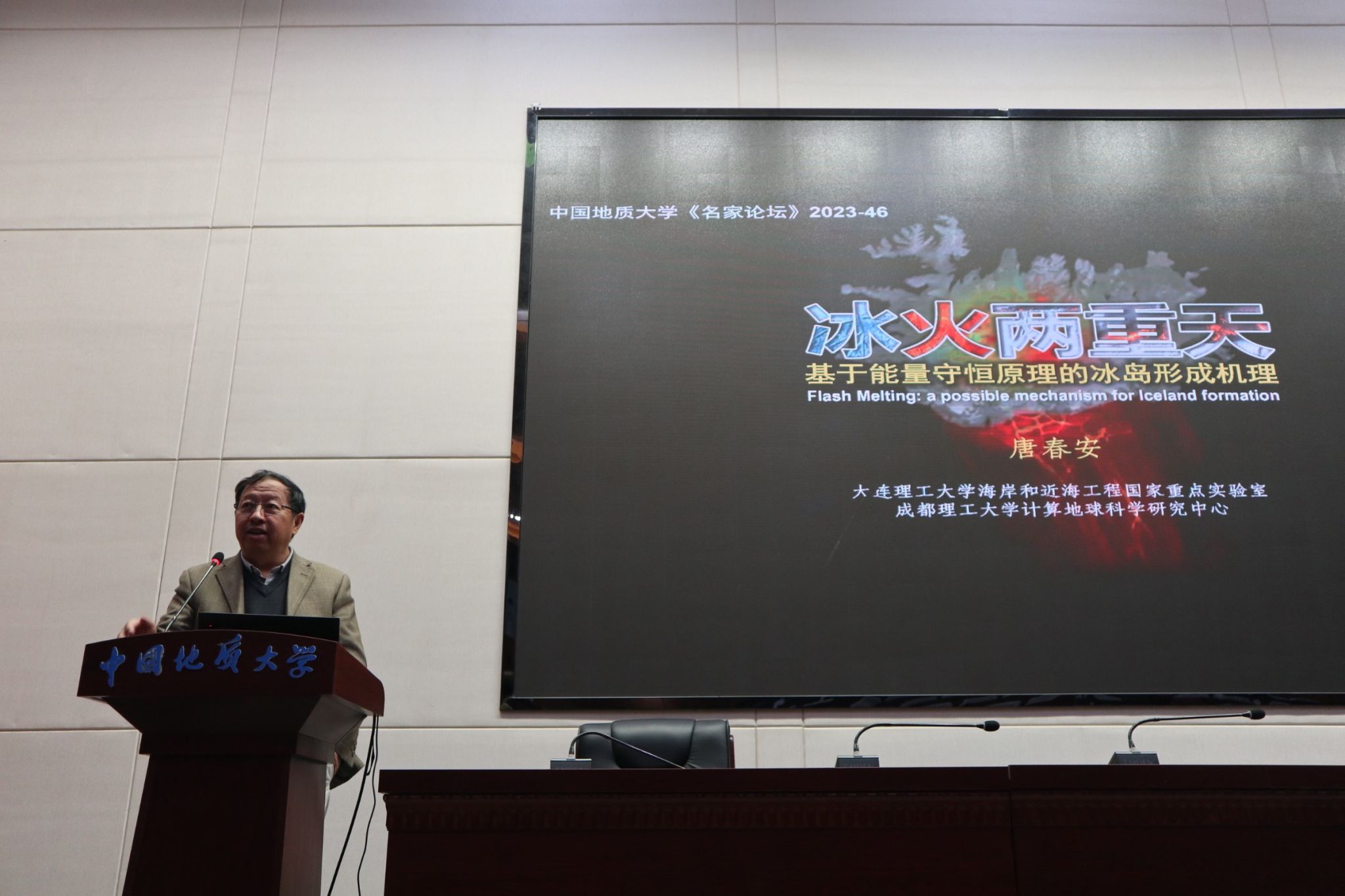 (通讯员 徐珊)11月29日上午,应地空学院蔡红柱教授与胡祥云教授邀请,大连理工大学唐春安教授来校访问,并在综合楼学术报告厅作了题为“冰火两重天:基于能量守恒原理的冰岛形成机理”的学术报告,全校60多位师生到场聆听讲座。